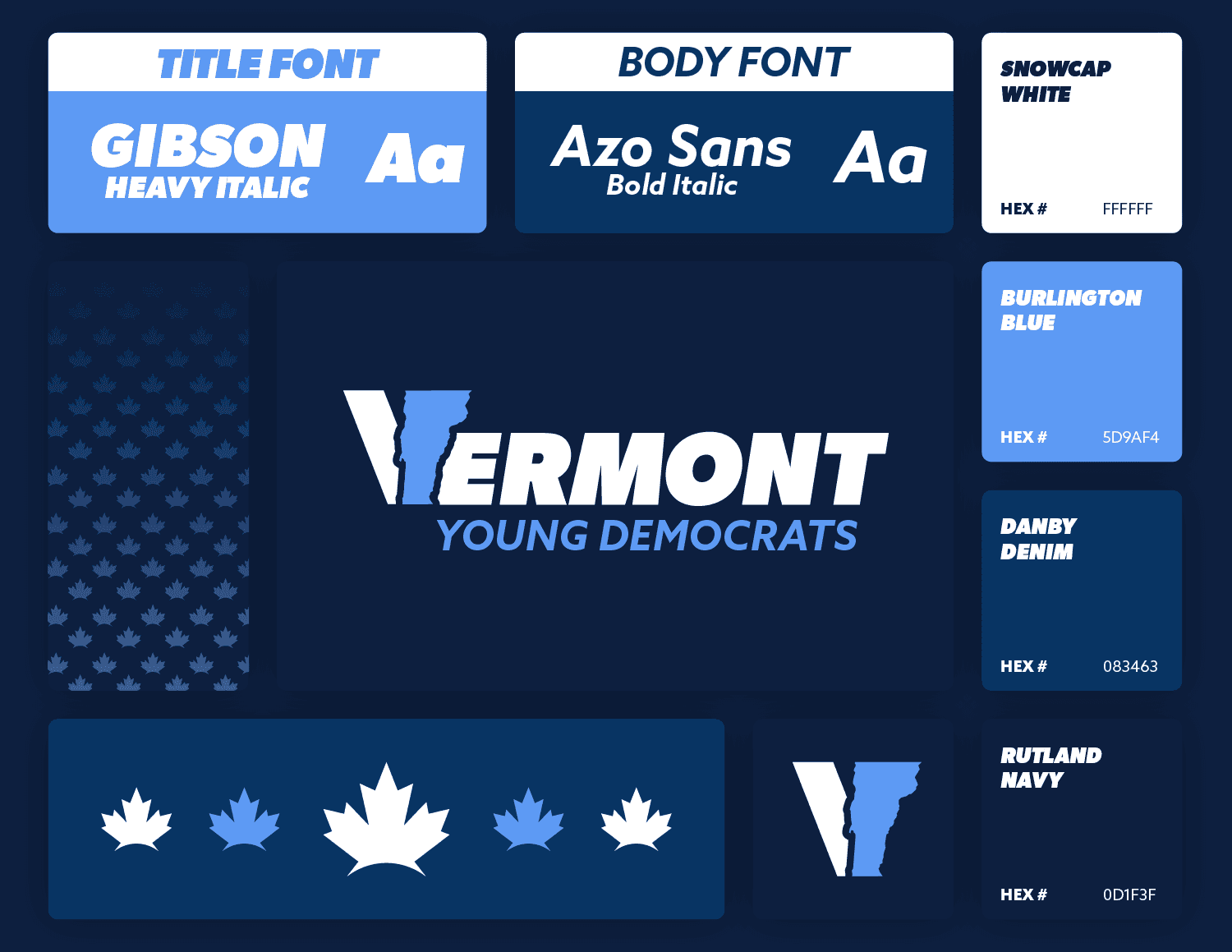 During its initial establishment, the Young Democrats of Vermont contracted me to create a logo and brand identity that would legitimize them from their outset. The Green Mountain State organization gave me creative freedom to take the branding in any direction.